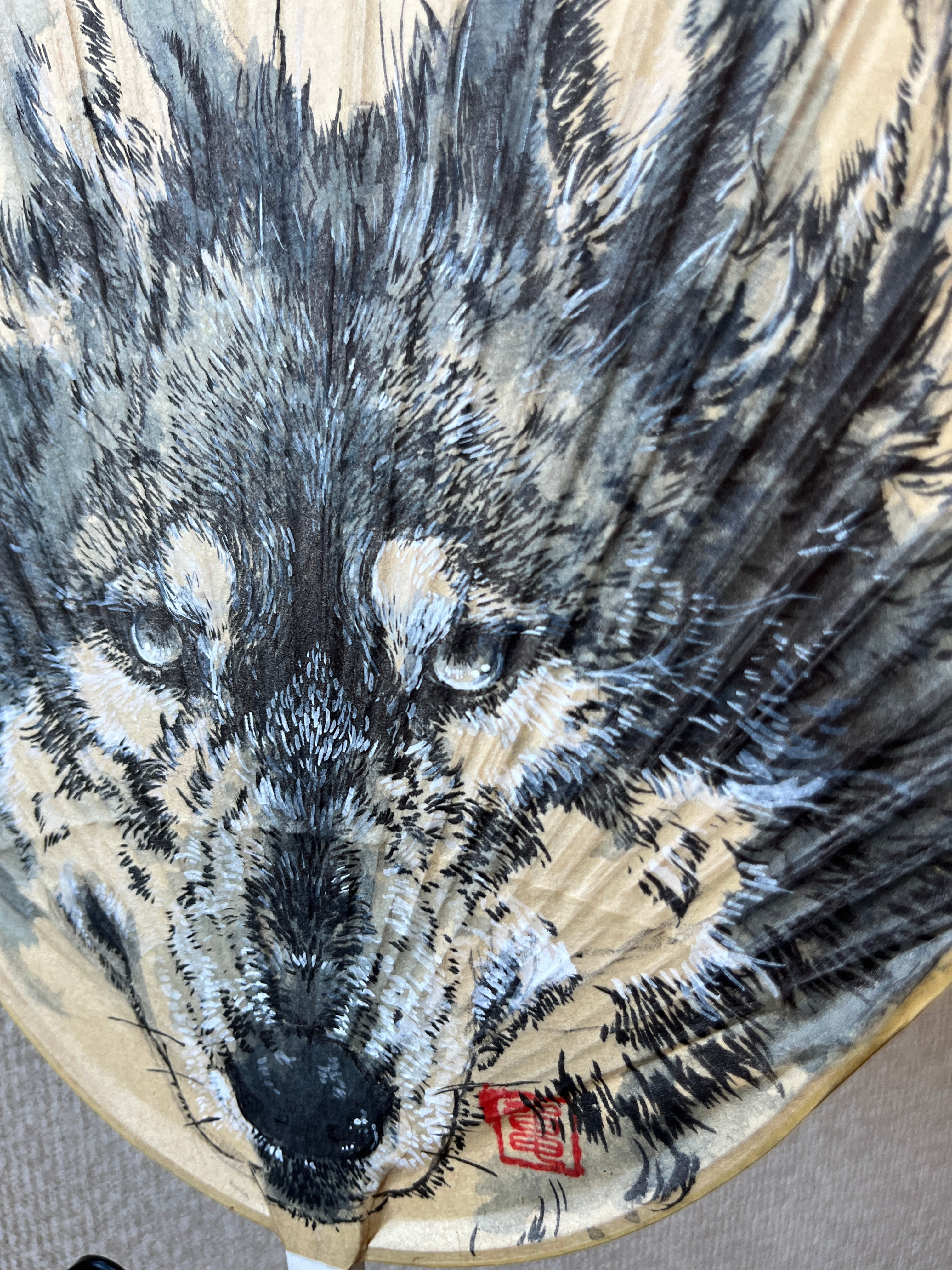 「秋の輝き」 たわわに実る秋の宝石 オオカミは肉食だけど 木の実もだいすき。 こちらの作品は着色銅の金彩を施し、反物には銀糸が織り込まれているため、お部屋の明かりでキラキラと作品が輝きます。動画をInstagramに掲載いたしますので是非ご覧くださいませ。 ーーー作品情報ーーー ▶︎原画 染絵作品・一点もの ▶︎素材 シルク100%(反物・銀糸) ▶︎技法 オリジナル染色技法(こちらの作品は染物です) ▶︎サイズ ・絵のサイズ5.8×12.8cm ・額のサイズ9×16cm厚み1.8cm ▶︎付属品 箱・黄袋・作品証明 ※額代込・お支払い確認後5日以内の発送となります ★額装について 一点ものの額に額装しており、画鋲で壁掛けができる仕様になっておりますので開封後すぐ、ご自宅で飾ってお楽しみ頂けます。 ★オリジナル染色技法について 反物、スカーフ、ブラウス、ドレスのシルク100%の生地などを使用し、紅型染を応用して研究の末作り出した独自の染色で作品を制作しています。 ほぼ水の状態の染液を調合し、滲みやぼかしを制御しながら狼の毛を一本一本大切に描き染めていく技法です。作品によっては型染や刷毛染などを使用し、銀彩金彩、胡粉の盛り上げなども使用しております。