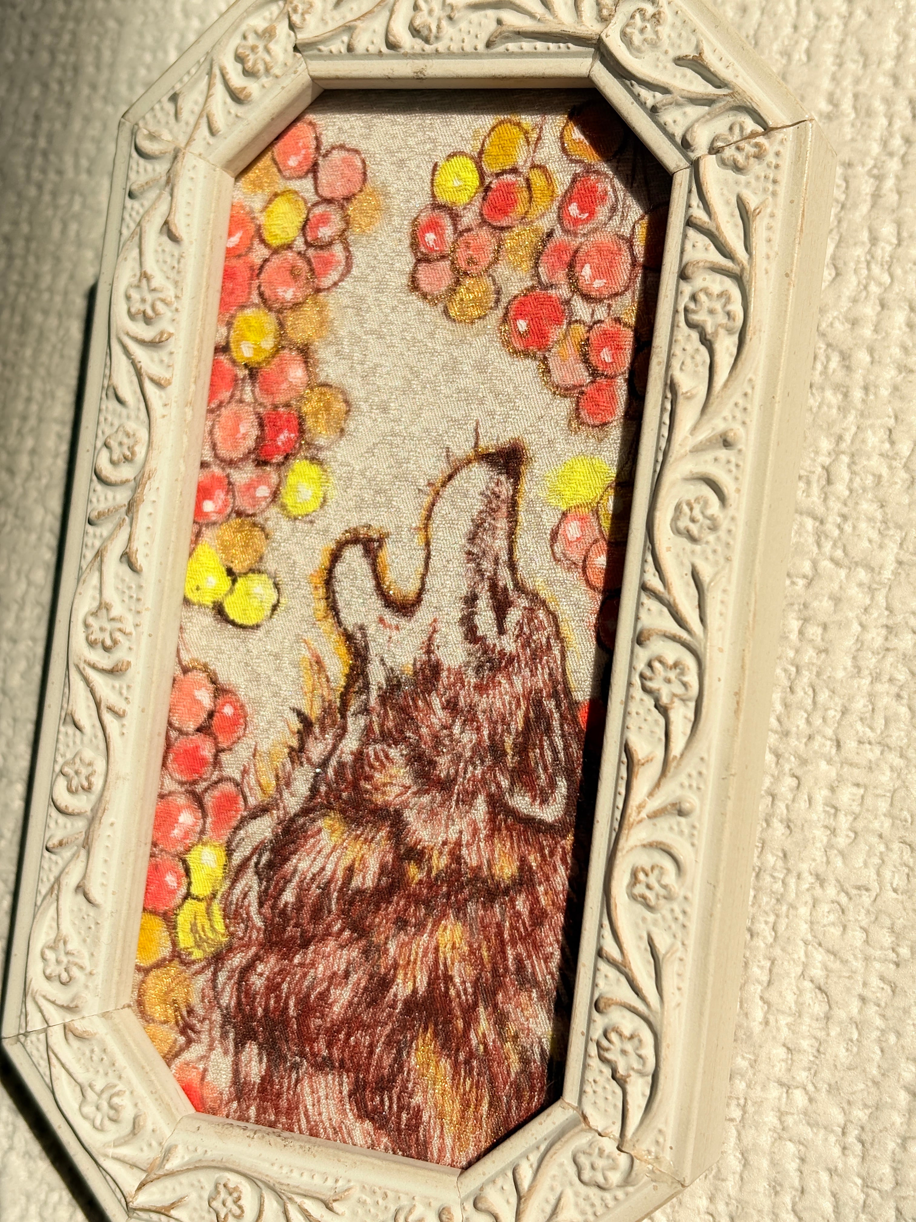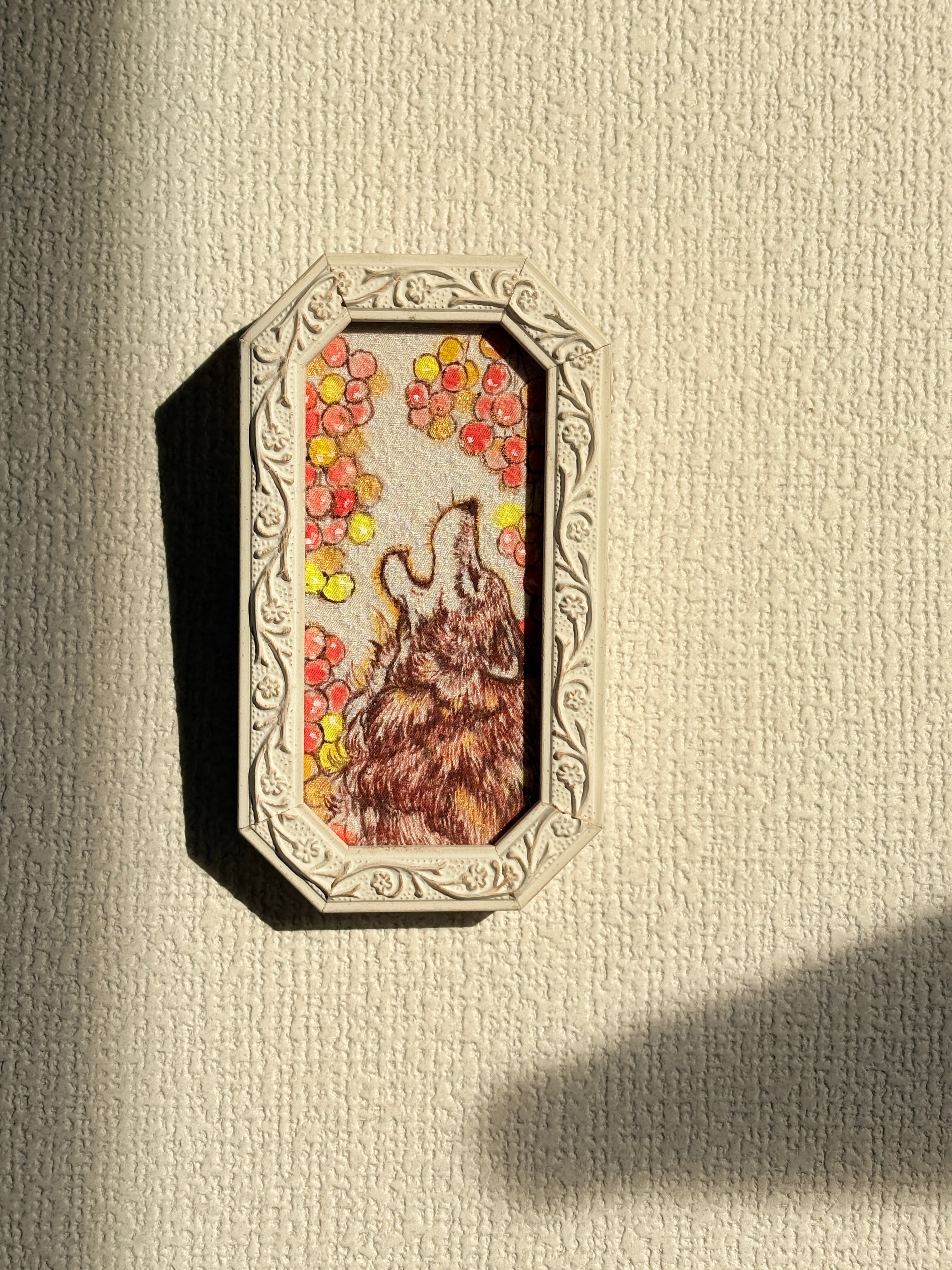 ほぼ水の状態の染液を調合し、滲みやぼかしを制御しながら狼の毛を一本一本大切に描き染めていく技法です。作品によっては型染や刷毛染などを使用し、銀彩金彩、胡粉の盛り上げなども使用しております。最近は膠も使用して強度を上げております。